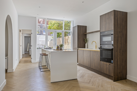 Beide ingangen van de (voormalig) 2 woningen zijn nog intact. Er is dus een keuze welke voordeur te gebruiken. Als laatste is een klein deel van deze indrukwekkende woning in gebruik geweest als Airbnb. De fysieke eigenschappen voor dubbel gebruik zijn nog intact voor de liefhebber, met 2 badkamers, 2 keukens etc. Beide voordeuren zijn te bereiken via een pad tussen de voortuinen naar de open (portiek)trappen naar de bordessen op de 1e etage. Hier zijn de prachtige eigen voordeuren. Een met het officiële huisnummer 113 rechts. Links is de voordeur naar huisnummer 123, dat als huisnummer nu officieel niet meer in gebruik is. Beschreven wordt nu de binnenkomst via de officiële voordeur op huisnummer 113. Binnenkomst in een lang vestibule met ruimte voor eventueel een fiets of kinderwagen. Eigen binnentrap naar de 2e (bovenste) etage. Hier is een lichte en ruime gang met een groot daklicht en een groot aantal mooie paneeldeuren. Voordat de indrukwekkende kamers en suite betreden worden zijn er eerst allerlei andere vertrekken te bereiken via deze gang. Er is het ruim ca 2m2 toilet met fontein. Er is de ruime badkamer met douche en breed wastafelmeubel. Er is een ruime vaste kast, en een 2e nóg ruimere vaste kast met plek voor de wasmachine, droger en (1e) CV ketel. De indrukwekkende kamers en suite zijn in spiegelbeeld dubbel uitgevoerd door de samenvoeging. Tussen de dubbele kamers en suite is in de achterkamers een brede doorgang gemaakt, waardoor het gevoel van immense ruimte is ontstaan in één groot “vertrek” van bijna 75m2! Er zijn hier een aantal extra factoren die het ruimtelijk effect en de heerlijke lichtinval versterken, zoals het feit dat de onder panelen van alle kozijnen als glazen ruit zijn uitgevoerd. Het hoge plafond van meer dan 3 meter draagt ook goed bij! Op de vloer liggen mooie grijs gelakte vloerplaten die drempelloos doorlopend zijn gelegd. Sfeer- en stijl verhogend zijn de 4 zwart marmeren schouwen en het lijstwerk aan de plafonds. De dubbele suite kamers geven toegang tot 4 balkons: elk 2 aan de voorzijde en elk 2 aan de achterzijde. Aan de achterzijde is aan de kant van huisnummer 113 via de achterkamer toegang tot de uitbouw. De uitbouw heeft hier 2 vertrekken achter elkaar. Eerst de nette en praktische keuken met alle apparatuur ingebouwd en aan 2 zijden aanrechtruimte. Voorbij de keuken is de slaapkamer van ca 11m2 met toegang tot het 5e balkon. Aan de andere kant (van huisnummer 123) wordt de uitbouw nu niet vanuit de achterkamer, maar vanuit de gang aldaar bereikt. Deze uitbouw heeft ook eerst een (2e) keuken (nu opgesteld in een L-vorm met alle apparatuur ingebouwd), en vervolgens ook een ruime slaapkamer met toegang tot het 6e balkon. De gang aan de kant van huisnummer 123 geeft ook nog toegang tot een voorzijkamer van ca 5.4m2. Er zijn bij deze gang nog 3 andere deuren: naar het toilet met fontein; naar de compacte douche (mét daklicht); en naar een ruime vaste kast met o.a. de opstelruimte voor de 2e CV ketel. En uiteraard is er aan deze zijde ook een gelijke (2e) trap naar de voordeur met vestibule ruimte.